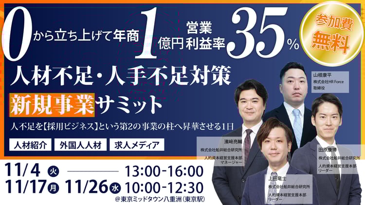 0から立ち上げて年商1億円・営業利益率35%! 人材ビジネス新規参入セミナー ~採用競争の激化が追い風に!採用市場の川上を制する人材ビジネス~